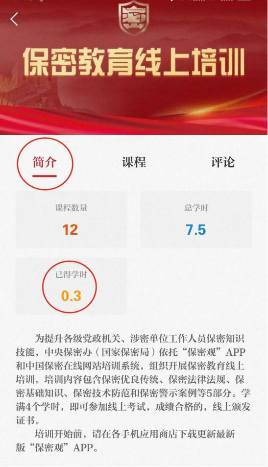 2.學習課程。進入系統(tǒng),點擊“課程”開始學習。課程內(nèi)容包含保密優(yōu)良傳統(tǒng)、保密法律法規(guī)、保密知識常識、保密技術(shù)防范和保密警示案例5部分,分為視頻和音頻兩種形式,合計7.5學時。